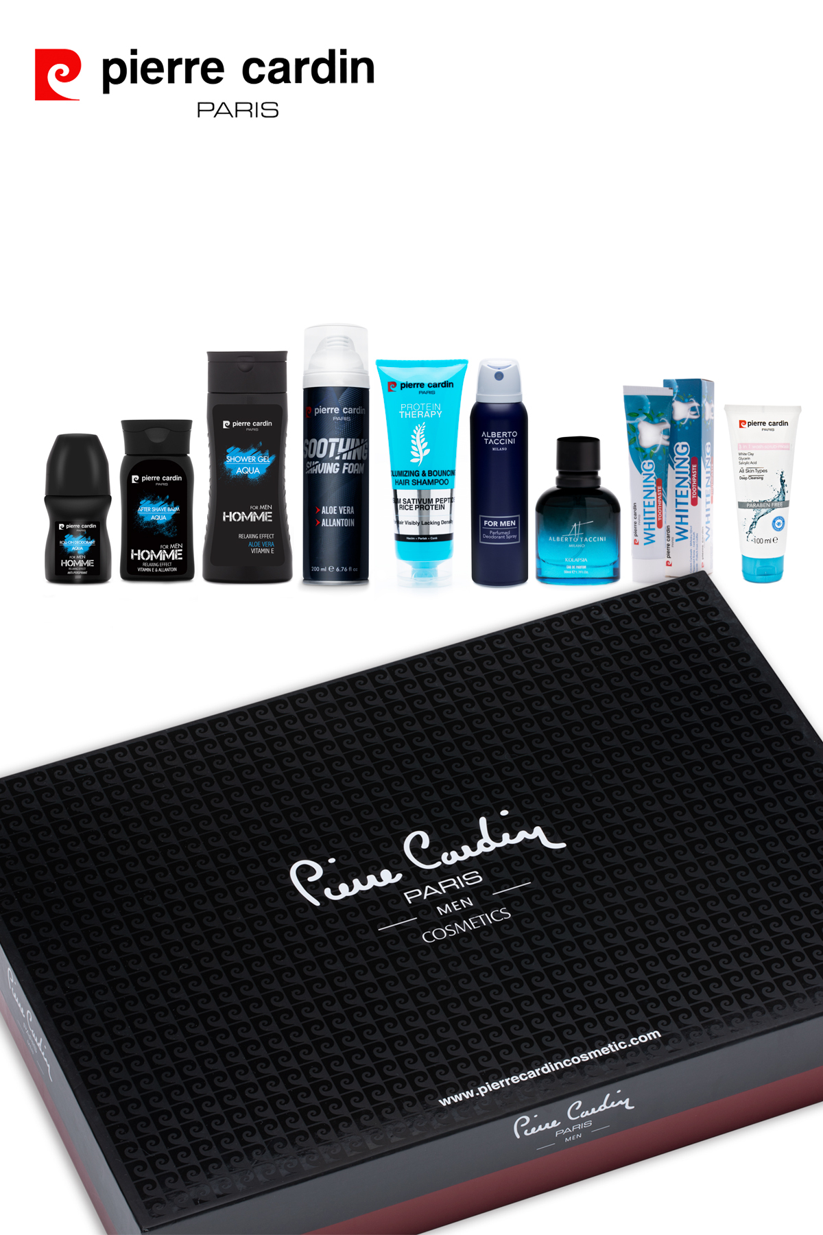 Pierre Cardin Elegants Erkek Çeyiz Seti 11’Li 33318 Pierre Cardin Shaving Foam For Men Traş Köpüğü 200 ML Pierre Cardin Men Tıraş Köpüğü içerdiği Allantoin, Aloe Vera özü ile cildinizi yatıştırır.; Gliserin içeren formülü ile cildinizi nemlendirerek kolay ve keyifli bir tıraş geçirmenize yardımcı olur.; Özel kokusu ile serinletici bir tıraş deneyimi sunar.; 33304 Pierre Cardin Aqua 48 Saat Etkili Antiperspirant Roll-On Deodorant – 50 ML Pierre Cardin Cosmetic Aqua Roll On, enerji dolu, macera tutkunu erkeklerin tercihi… Terlemeyi önleyen anti-perspirant formülü sayesinde gün boyu koltuk altınızda güven sağlar.; Pierre Cardin Kozmetik Aqua Roll On kıyafetlerde ıslaklığa ve lekeye neden olmaz.; Hassas ciltlerin de severek kullanacağı roll-on deodorant… 40658 Alberto Taccini Kolapsia Erkek Parfümü Erkek bedeninin muhteşemliği etkileyici bir kokuyla buluşuyor! İçeriğinde bulunan ve son derece uyumlu olan esanslar sayesinde kendinizi her an özel hissedebileceksiniz.; Girdiğiniz her ortamda sizden önce ortama girecek ve bütün ilginin üzerinizde yoğunlaşmasını sağlayacağını göreceksiniz.; Üst Nota : Baharatlı, Narenciye Orta Nota : Safran, Tarçın, Odunsu Dip Nota : Topraksı, Tatlı, Misk 33301 Pierre Cardin Aqua Aloa Vera ve E Vitaminli pH Dengeli Canlandırıcı Duş Jeli – 300 ML Pierre Cardin Cosmetic Aqua Men duş jelinin rahatlatıcı etkisine karşı koyamayacaksınız.; İçeriğindeki Aloe Vera ve vitamin E sayesinde vücuda gereken nem takviyesini sağlar.; Pierre Cardin Kozmetik Aqua Duş Jelinin, erkeksi kokusu ile duştan çıktıktan sonra da ferahlatıcı etkisi devam edecek.; 19501 Pierre Cardin 3 In 1 Face Mask 100 ML – 3’ü 1 Arada Yüz Temizleme Peeling Maskesi Fark yaratan Pierre Cardin Cosmetic 3’ü 1 arada formül ile her kullanımda yenilenmiş bir ten.; Beyaz kil mucizesi ile yüzünüzdeki değişimi gözle görülür bir şekilde hissedecek ve pürüzsüz cildinizin tadına varacaksınız.; Pierre Cardin Kozmetik 3 In 1 Face Mask, parabensiz formülü ile doğallıktan vazgeçmeyen kadınların tercihi… Tüm cilt tiplerinde, yağ dengesini sağlamakta bir numara formülü ile vazgeçilmeziniz olacak.; Ürünü; nemli yüzünüzde bekletmeden, yalnızca ovalayarak peeling şeklin de dakika bekletip maske olarak uygulayabilirsiniz.; Bu aşamaların ardından yüzünüzü ılık su ile durulamayı unutmayın.; 33303 Pierre Cardin After Shave Balsam 150 ML – Aqua Tıraş Sonrası Balsam Tıraş keyfinize Pierre Cardin Cosmetik ile balsam pürüzsüzlüğünde bir son hazırlamaya ne dersiniz? Pierre Cardin Kozmetik ve Kişisel Bakım ürünü olan Aqua After Shave Balsam, Vitamin E ve Allantoin içeren formülü sayesinde cildi nemlendirir pamuksu bir tene kavuşmanızı sağlar.; Taze kokusu sayesinde dinamik güne, Aqua Men Tıraş sonrası balsam ile merhaba diyeceksiniz.; 33320 Alberto Taccini Deodorant For Men – 150 ML Alberto Taccini For Men Deodorant gün içinde oluşabilecek koku ve ter için etkili bir deodorant.; Hem iş yaşamı ve sosyal ortamlarda hem de spor yaparken cildinizde maskülen etki ve ferahlık bırakıyor.; Enerjik kokusu her an cildinizi dinç tutar ve tüm bu nitelikleriyle yeni güne başlarken vazgeçilmez kişisel bakım ürününüz olabilir.; 39607 Pierre Cardin Protein Therapy Hacim ve Dolgunluk Veren Şampuan – 250 ML Protein Therapy -Volumizing & Bouncing Hair Shampoo Bezelye Peptid & Pirinç Proteinli Hacim ve Canlılık Veren Bakım Şampuanı Protein Therapy Hacim ve Canlılık Veren Bakım Şampuanı, hacmini ve canlılığını yitirmiş saçlar için geliştirilmiştir.; İçeriğindeki Bezelye Peptiti ve Hidrolize Pirinç Proteini saçın hacimli ve canlı görünmesini sağlar.; -Hacimli Saçlar -Canlı Görünen Saçlar-Doğal Parlaklık-Kadife Hissediş Pierre Cardin Beyazlatıcı Diş Macun 75ml Calcium carbonate içeren güçlü formülü dişlerinizin beyazlamasına yardı mcı olur.; Nane aroması ağızınızda hoş bir koku ve ferah nefes bırakır.; Mineral bakımından zengin formülü ağız bakım rutininizde kendinizi iyi hissettirir.; 14389 Pierre Cardin Tırnak Makası 15306 Pierre Cardin Cımbız