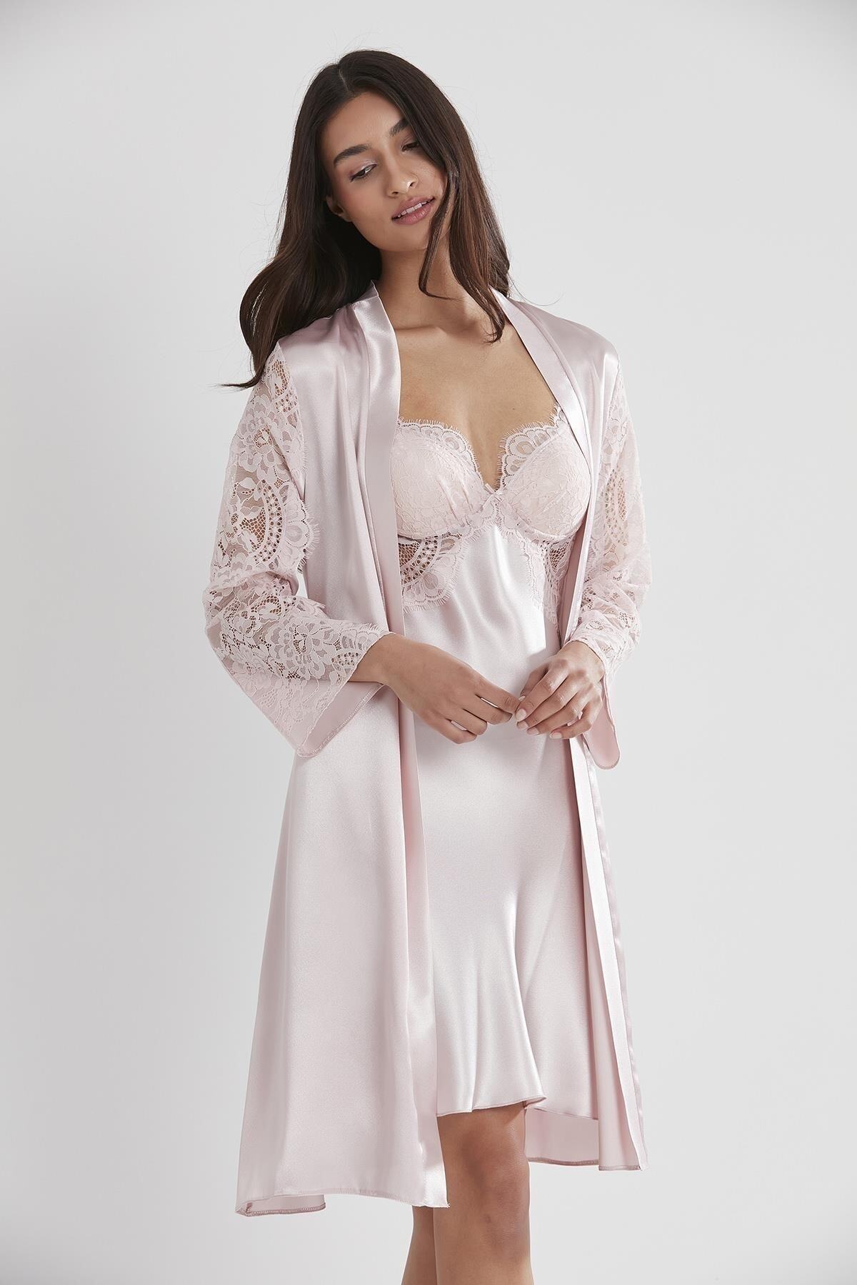 Saten dantelli gecelik & sabahlık takım – 2 parçadan oluşmaktadır.; Orijinal kutu içerisinde, birlikte paketlenmiştir.
