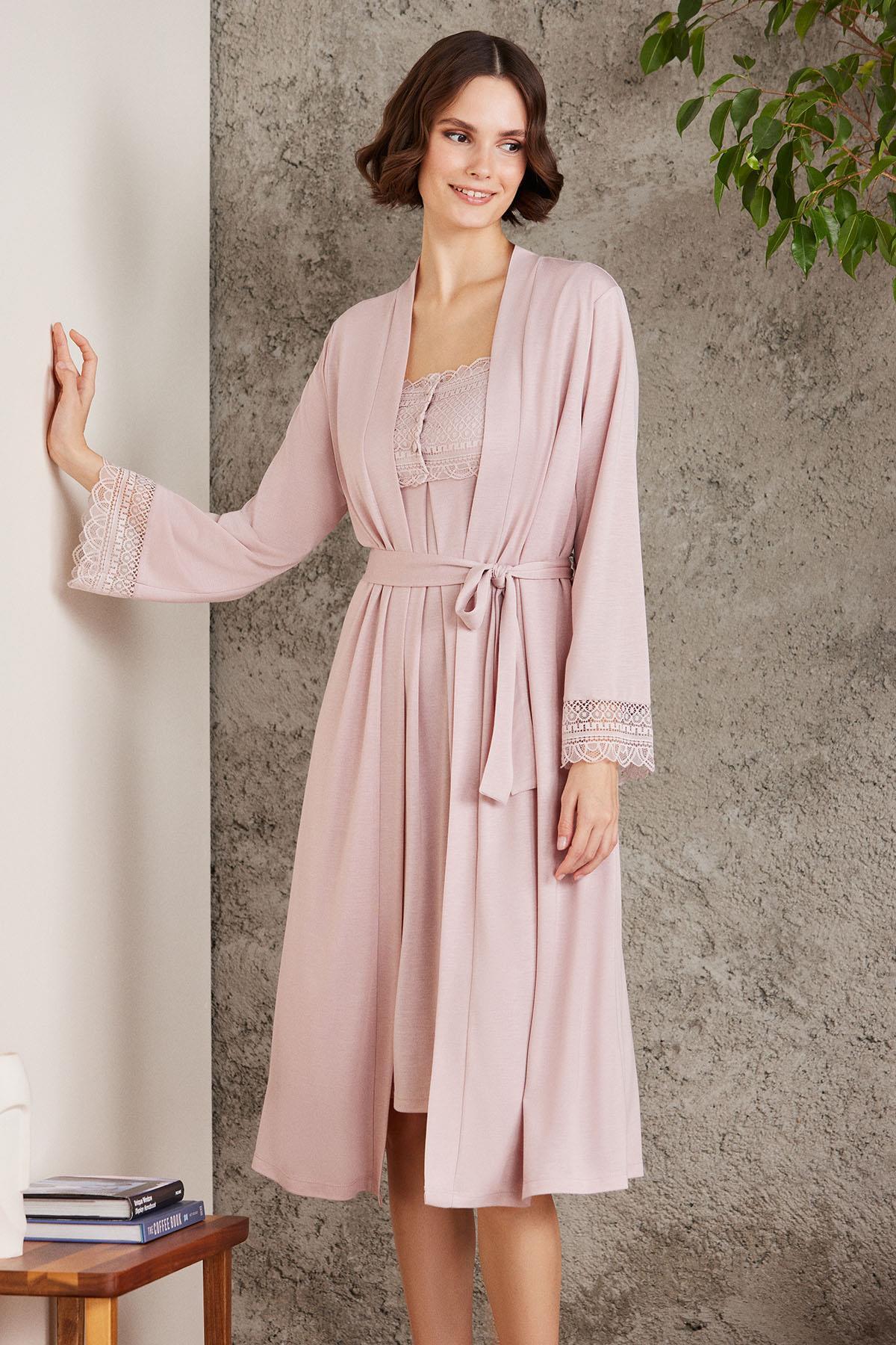 Penye Dantelli Kadın Gecelik Ve Sabahlık Takım – 4015 Pudra