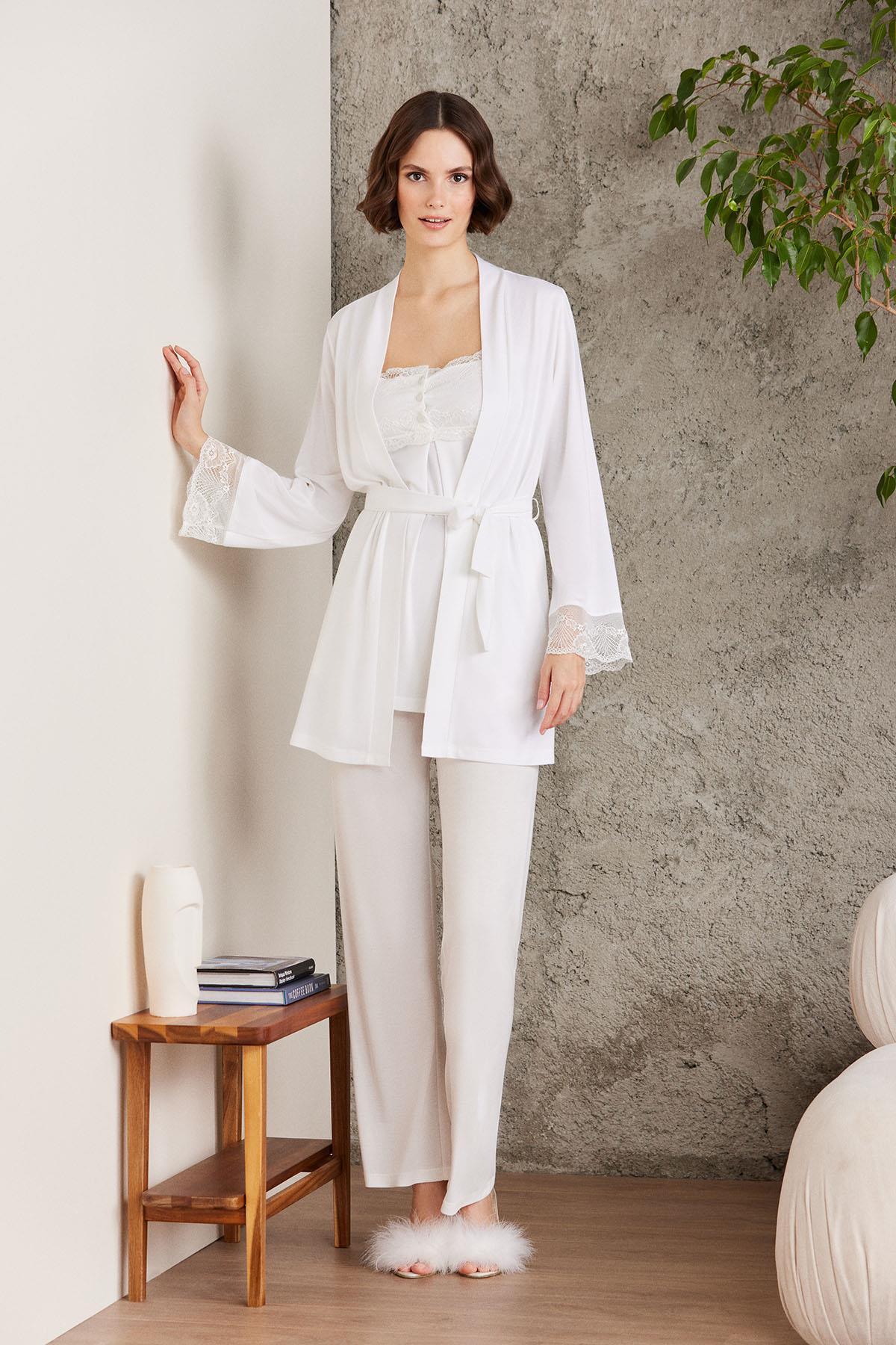 Dantelli – Penye 3lü Pijama Takım – 3 parçadan oluşmaktadır.; Sabahlık, Pijama Alt, Pijama Üst, orijinal kutu içerisinde, birlikte paketlenmiştir.