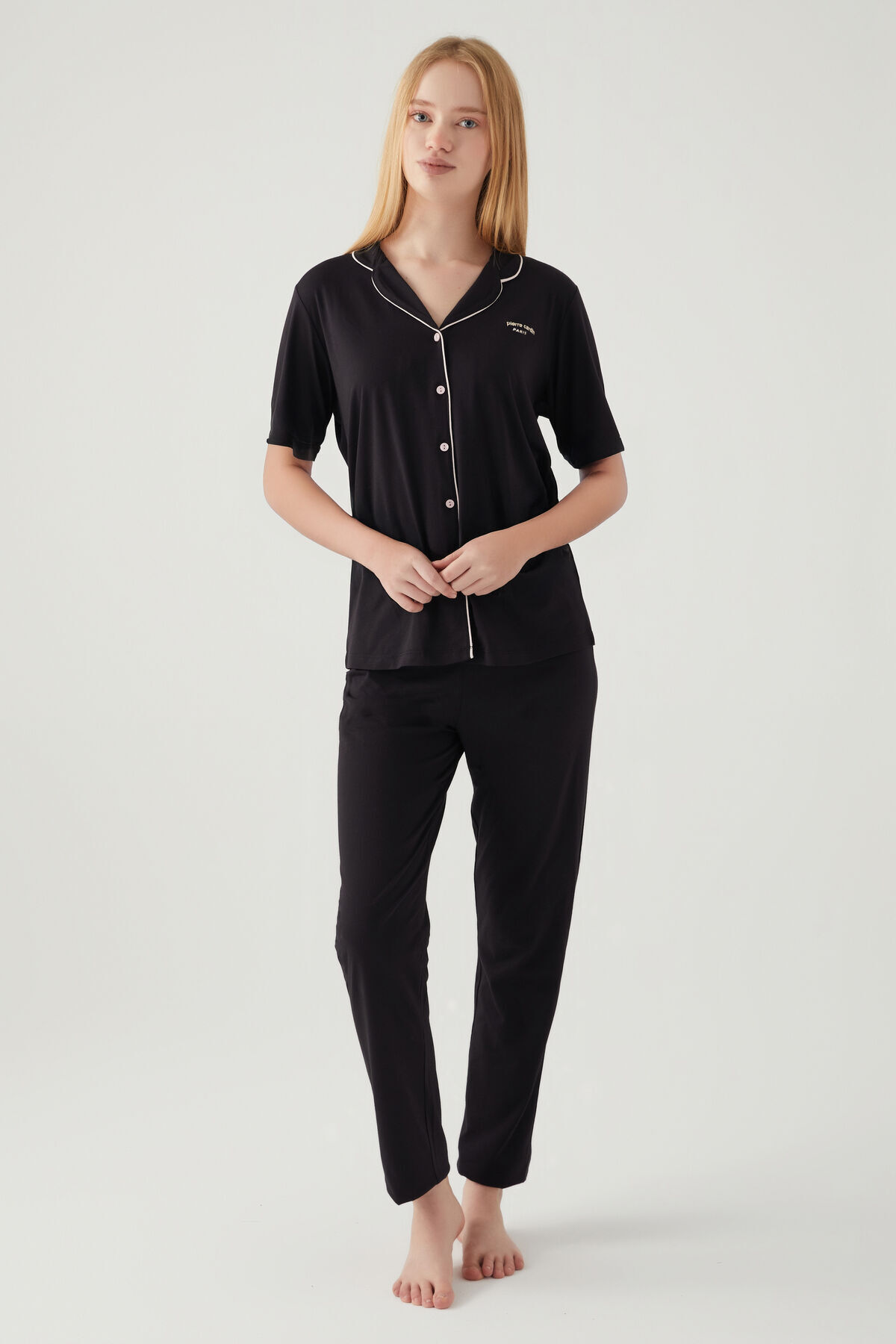 Pierre Cardin 7715 Kadın Siyah Kısa Kollu Önden Düğmeli Biyeli Gömlek Pijama Takımı Birinci Sınıf Modal Kumaştan Dikilen Takımımız Önden