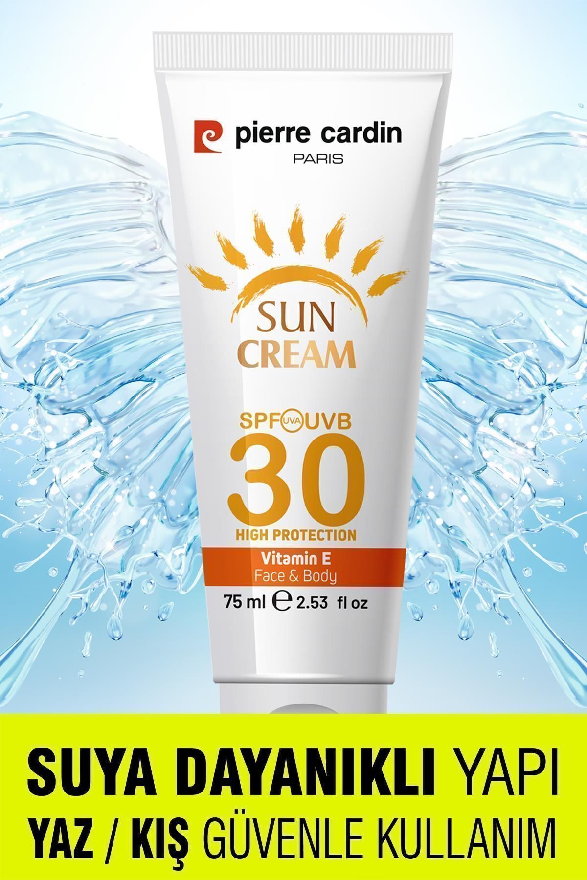 Pierre Cardin SPF 30 Leke Karşıtı Yüksek Koruyucu Yüz Güneş Kremi 75 ML Normal Ve Kuru Ciltler İçin Normal ve Kuru Ciltler için Yüksek Koruma 75 ML güneş ışınlarının oluşturabileceği cilt lekelerine karşı etkili koruma sağlar.; ; Leke önleyici bakımın olmazsa olmazı aktifler, güneş kremi ile birleşerek daha ışıltılı ve pürüzsüz bir görünüm sağlar.; ; Pierre Cardin Leke Karşıtı Güneş Koruyucu Krem SPF 50+, güneşin zararlı ışınlarının sebep olduğu, cilt lekelenmeleri ve yaşlanma belirtileri gibi durumlar için özel olarak geliştirilmiştir.; ; İçerisindeki SPF 30+ ile cildinize UVA/UVB koruma sunarken, güneş güneş ışınlarına karşı kalkan görevi görerek, tek ton ve pürüzsüz bir cilt görünümü sağlamaya yardımcı olur.; ; Dört mevsim boyunca tüm cilt tipleri için günlük kullanıma uygundur.; ; Su bazlıdır, ciltte yağlı his bırakmaz.; ; E Vitamini: Cildin iç ve dış katmanını besleyerek daha canlı olmasına destek olur.; ; Güneş ışınlarının korunmasız ciltle temasının neden olabileceği yaşlanma, kırışıklık, leke ve cilt kuruluğu gibi durumların yanı sıra UVA/UVB ışınlarına yönelik yaz kış cildin korunmasına yardımcı olması için geliştirdiğimiz bir güneş koruma ve bakım ürünüdür.; ; Yüksek emilim özelliği sayesinde ciltte yağlı bir his bırakmadan doğal nem dengesine destek vererek yumuşaklık ve pürüzsüzlük kazandırmayı amaçlamaktadır.; ; İçeriğindeki Vitamin E ve Gliserin içeren özel formülü cildinizi nemlendirir.; ; Cildinizi güneş ışınlarına karşı çok yüksek seviye koruma sağlar.; ; Hafif ve hoş kokusunu teninizde hissedeceksiniz.; ; NASIL KULLANILIR? Suya dayanıklı ve tüm cilt tipine uygun yapısıyla güneş kremini, güneşe çıkmadan 20-25 dakika önce cildinize bol miktarda sürüp masaj hareketleri ile yayınız.; ; Yüz, boyun ve dekolte bölgesine uygulanır.; ; Cilt üzerindeki dayanıklılık süresine bağlı kalmaksızın Korumayı sürdürmek için kreminizi 1,5 ile 2 saatte bir yenileyin.; ; Terleme ve ıslanma sıklığına göre bu süreyi daha da kısaltabilirsiniz.; ; Yaz kış kullanılmasını tavsiye ediyoruz.; ; Su bazlı yapısıyla makyaj altı baz için kullanıma uygundur.; ; Ürün İçeriği :Aqua, Ethylhexyl Methoxycinnamate, Glyceryl Stearate, Butyl Methoxydibenzoylmethane, Glycerin, Caprylic/Capric Triglyceride, Isopentyldiol, Octocrylene, Ceteareth-20, C12-15 Alkyl Benzoate, Ceteareth-12, Cetearyl Alcohol, Cetyl Palmitate, Phenoxyethanol, Parfum, Sodium Polyacrylate, Tocopheryl Acetate, Xanthan Gum, Ethylhexylglycerin, Tetrasodium EDTA, Hydroxycitronellal.;
